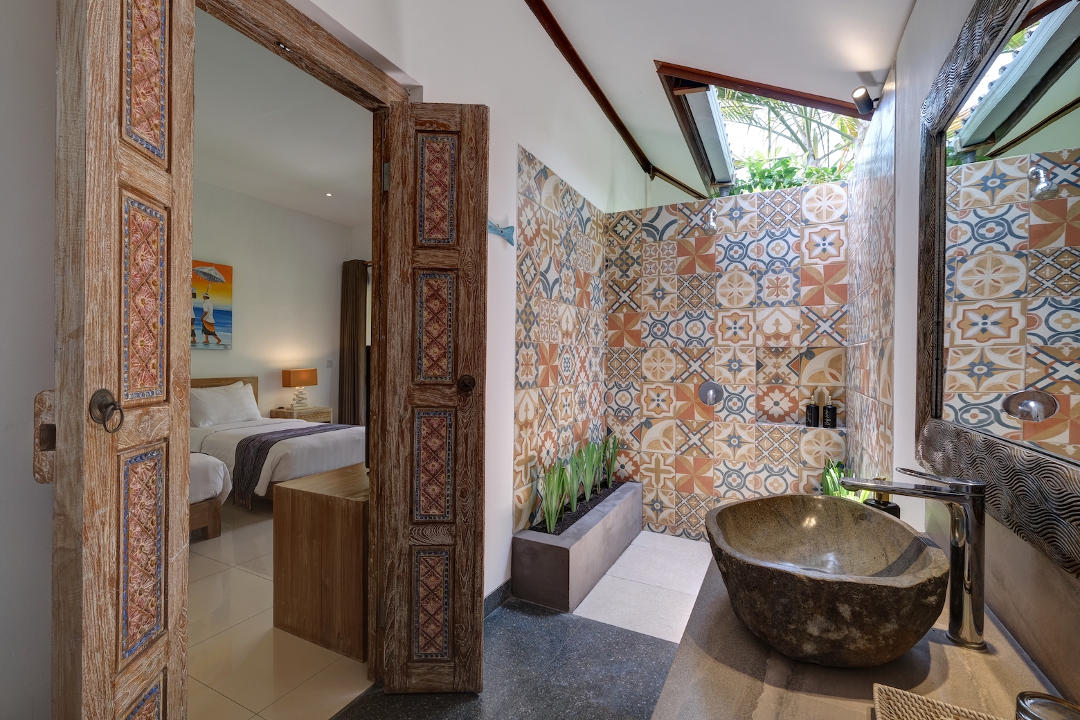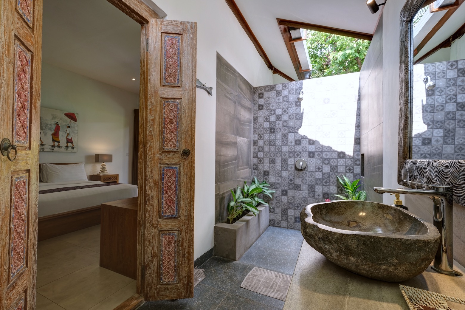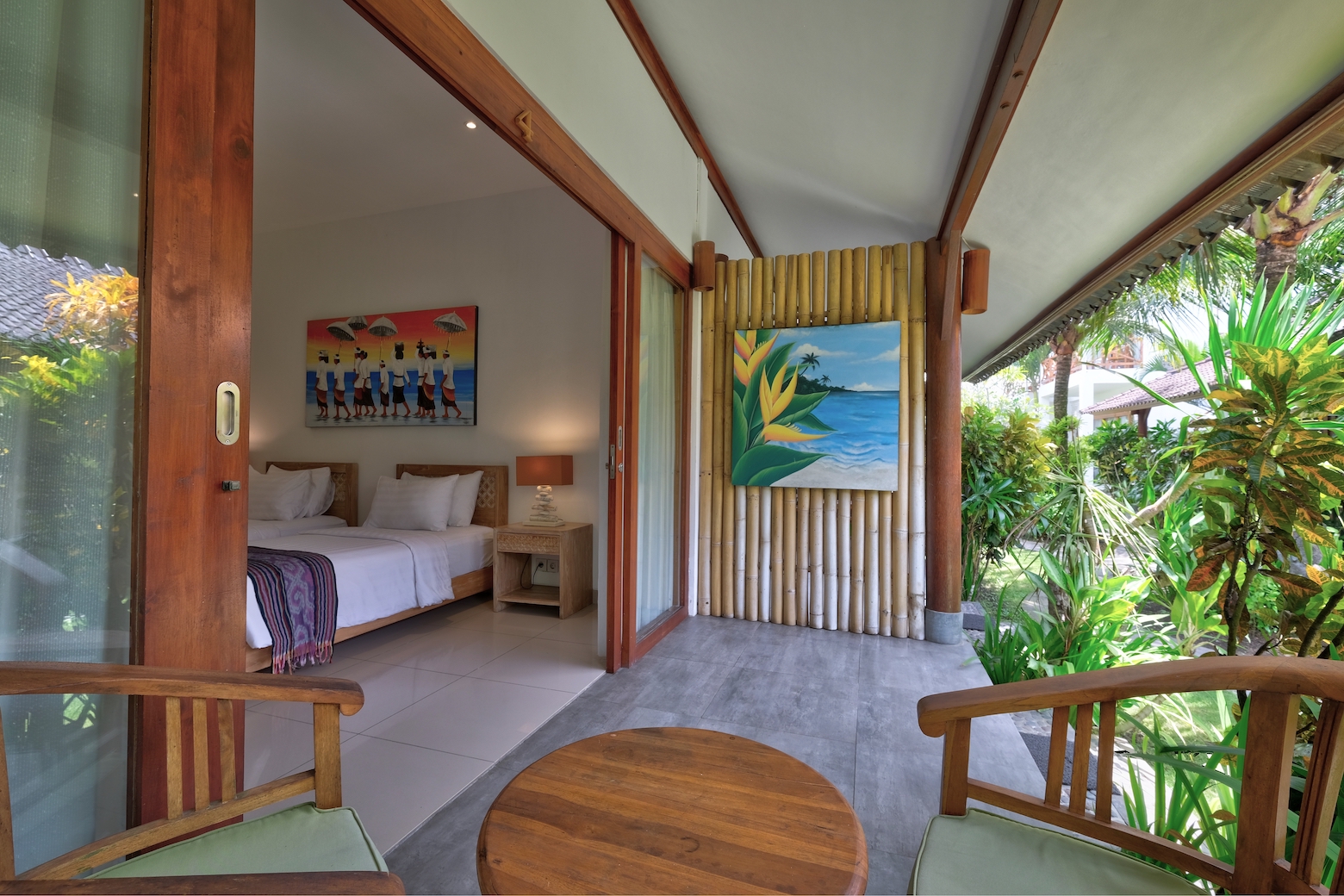 This luxurious double or twin room features a private verandah surrounded by green tropical vegetation and an ensuite, open-air bathroom