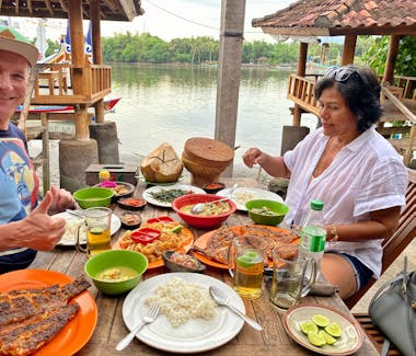 As the sun begins to set you will be served a traditionally prepared seafood dinner, right by the water’s edge close to the Perancak River mouth: a variation of seafoods, rice, and two kinds of chili sambal and veggies.